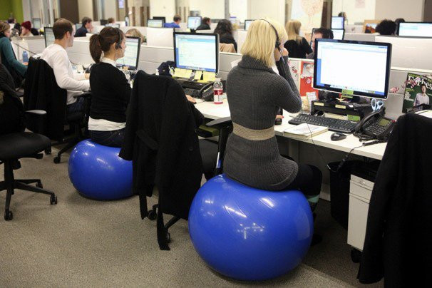С растущей популярностью различных фитнес-программ работники и в офисах пытаются придерживаться здорового образа жизни. Поэтому, не стесняясь, экспериментируют с мячами в качестве стульев. Известно, что в продвинутом штате Калифорния, где расположен офис известного информационного портала Google, около половины сотрудников сидят на мячах. Новый тип стула можно встретить и в других крупных компаниях, школах и домашних кабинетах. Эксперты по физкультуре объясняют, что пока сотрудник сидит на мяче без спинки, то ему волей-неволей приходится соблюдать концентрацию и баланс, чтобы сидеть на нем прямо. В то время как на стуле люди могут позволить себе расслабиться и принять неправильное положение.