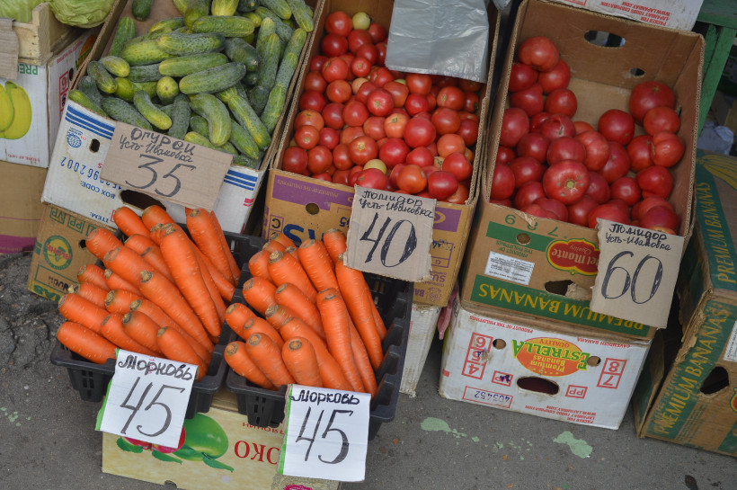 Здесь можно купить овощи, мед, хлебобулочные изделия, полуфабрикаты домашнего производства, мясо. Цены на помидоры колеблются в пределах от 50 до 80 рублей за килограмм в зависимости от сорта, огурцы стоят от 25 до 40 рублей. Картофель урожая этого года можно прибрести за 35 рублей, кабачки – от 25 до 30 рублей за килограмм. За баклажаны фермеры берут 50 рублей, за мед – от 180 до 220 рублей за кг. Максимальная стоимость мяса — 330 рублей за килограмм свиной вырезки и 350 рублей — говядины.