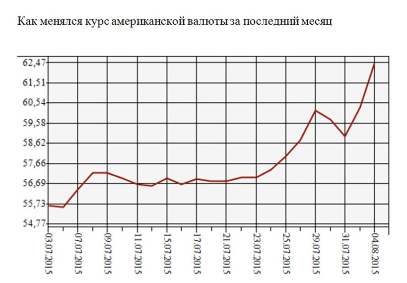 Темпы роста цен на валюту стали увеличиваться еще на минувшей неделе. В прошлую среду, 29 июля, официальный курс доллара преодолел, как говорят эксперты, психологически важную отметку — 60 рублей. В начале новой недели валюта продолжила укреплять позиции. Во вторник официальный курс ЦБ РФ составлял 62,46 рубля за доллар и 68,58 — за евро.