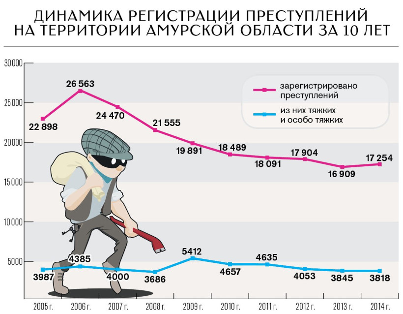 — В целом криминогенная обстановка в Амурской области не вызывает тревоги. Если посмотреть динамику преступлений за последние десять лет, то начиная с 2006 года общая преступность у нас снижается. По тяжким и особо тяжким был небольшой всплеск в 2009-м, но в последующие годы тенденция к снижению сохранялась. Понятно, что кривая уровня преступности не может быть постоянно в глубоком пике. Когда-то дойдет до нижнего предела и начнется небольшой рост. Пока этого не происходит. По итогам семи месяцев 2015-го в целом имеем 2 процента снижения, а по тяжким и особо тяжким преступлениям — минус 1,8 процента.