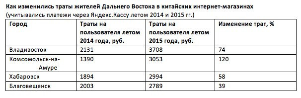 В других городах Дальнего Востока траты покупателей также выросли: в Хабаровске — на 58 %, во Владивостоке — на 74 %, а в Комсомольске-на-Амуре — на 120 %.
