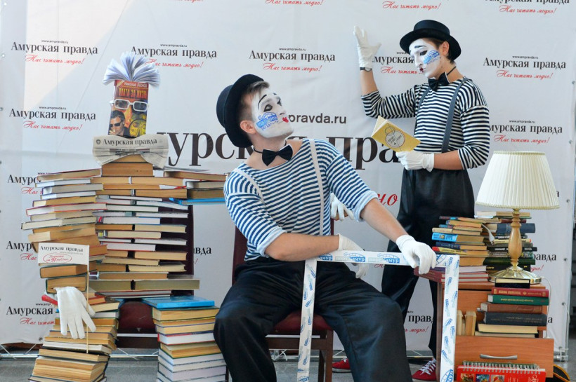 Очередной сюрприз устроила редакция газеты «Амурская правда» своим читателям и поклонникам фестиваля кино и театра «Амурская осень». В фойе ОКЦ заработал новый фотосалон, где гостей встречали не только фотокорреспондент и журналисты АП, но и граф Почитаев-Амурский — наша книжная инсталляция. Со скульптурой из книг с удовольствием фотографировались зрители, гости фестиваля и члены жюри. А некоторые еще и подписались на «Амурскую правду» и получили за это подарки: футболки, кружки, блокноты, закладки и подушки читателя, а также билеты на мероприятия фестиваля. Снимки можно найти на нашем сайте в разделе «Фотогалереи». Фотосалон работает ежедневно с 18 до 19 часов до 20 сентября. А подписаться на газету можно на три месяца или полугодие.