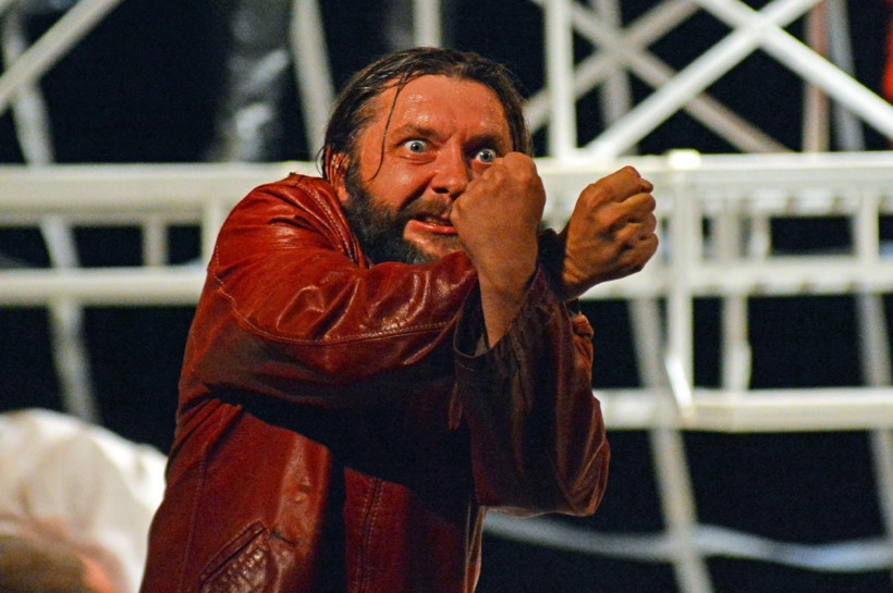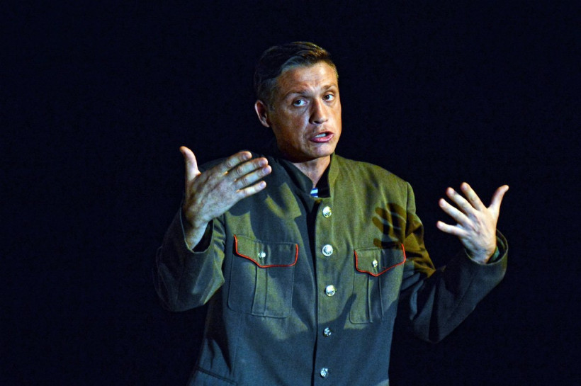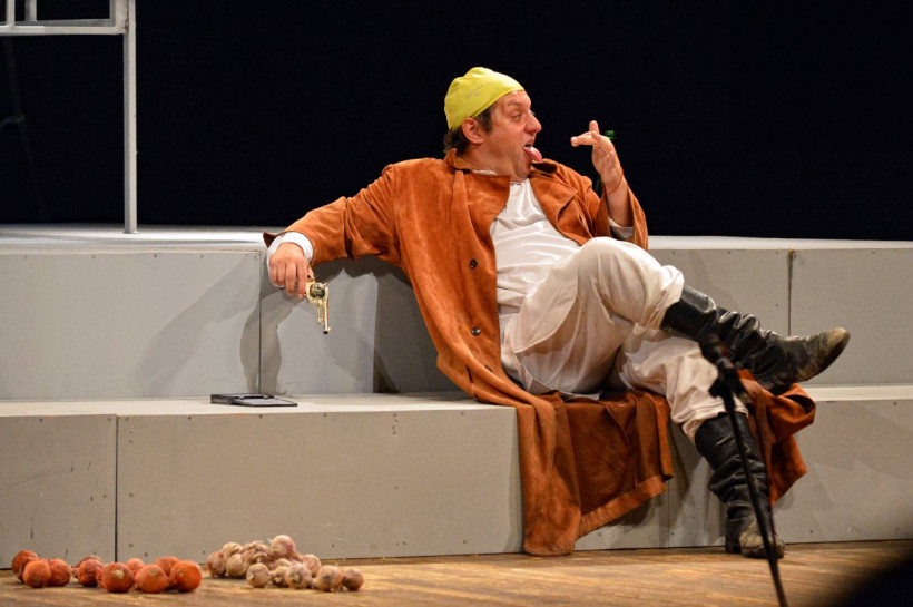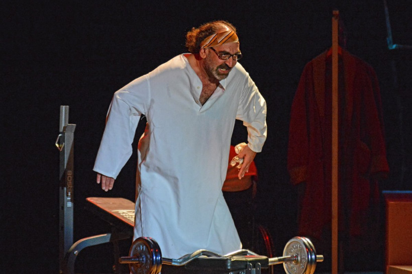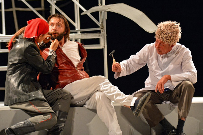 Добавляли сумасшествия на сцене и бородатая лысеющая «дева Мария», которая по ночам ходит, точнее летает на тренажере, на страстные свидания к Шварценеггеру. И герой Полицеймако, который одновременно может быть и Небесным светом, и Котовским (стоит только натянуть желтую плавательную шапочку), и безумным наркоманом-алкоголиком.