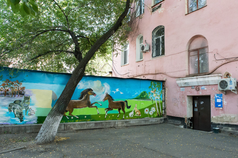 Высокохудожественное панно все лето создавал после работы талантливый, но пока неизвестный дворник в Благовещенске. Местные жители многоэтажек по улице Ленина, расположенных между Чайковского и Пушкина, рассказали, что мужчина каждый день занимался украшением неприглядного забора, изображая на нем красочную амурскую природу.