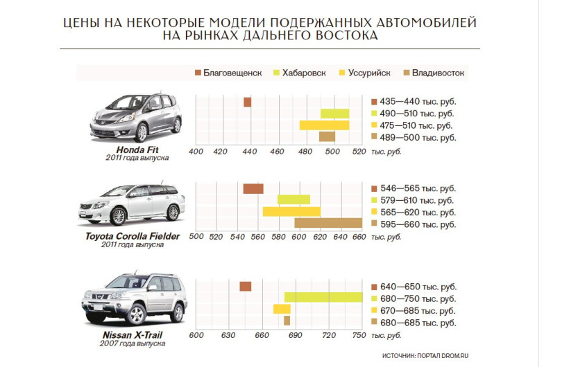 По словам Андрея Броскова, во Владивостоке и Уссурийске в связи с высоким курсом валют себестоимость автомобилей возросла на десятки и даже сотни тысяч рублей, поэтому новых поступлений на рынок буквально единицы. Покупать машины в Японии по высокой цене, а потом еще и платить за нее высокую пошлину, стало рискованно — потом ее не сможешь продать. Поэтому акценты сместились в пользу пробежных автомобилей, имеющихся на рынке. А поскольку на приморских рынках отовариваются со всей России, найти подходящий автомобиль по приемлемой цене становится все сложнее.