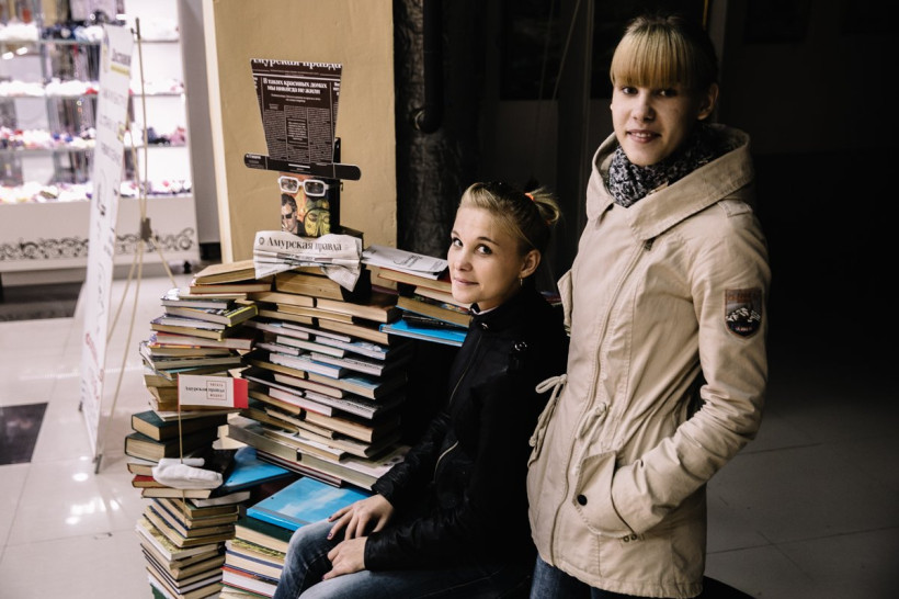 Книжный человек в честь Года литературы был изготовлен специально для фестиваля «Амурская осень». Лозунг фотосалона АП — «Читать модно!». Книги для фотосалона собраны журналистами АП, часть передана в дар ИПК «Приамурье». Старые книги в инсталляции обрели вторую жизнь, а некоторые спасены от плесени и разрушения. В фотосалоне «Амурской правды» в фестивальные дни с удовольствием фотографировались артисты, зрители и известные люди Приамурья. Теперь книжная скульптура встречает гостей в Арт-галерее, расположенной на первом этаже ТРЦ «Острова». Сфотографироваться с ним может любой желающий.