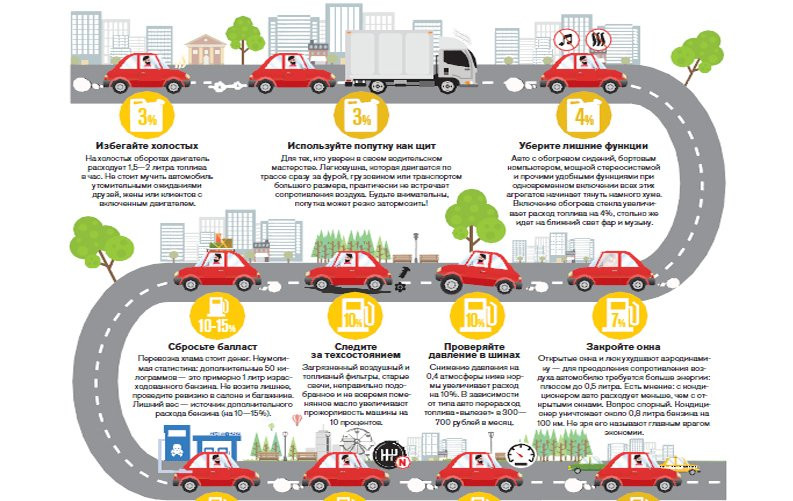 Перевозка хлама стоит денег. Неумолимая статистика: дополнительные 50 килограммов — это примерно 1 литр израсходованного бензина. Не возите лишнее, проведите ревизию в салоне и багажнике. Лишний вес — источник дополнительного расхода бензина (на 10—15%).