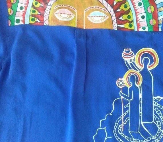 Способ росписи одежды довольно прост: берем вещь, например, рубашку, под нее кладем картон, потом сухим мыльцем наносим контур и расписываем уже красками, объясняет художница.