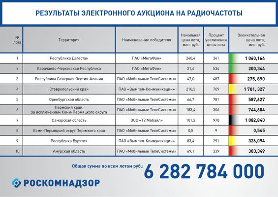 На торги Роскомнадзор выставил десять лотов: ресурс в диапазоне 1800 МГц в девяти регионах страны — Дагестане, Карачаево-Черкесии, Северной Осетии, Ставропольском и Пермском краях (два лота), Оренбургской, Самарской, Амурской областях и Республике Бурятии. Начальная цена торгов для каждого лота была рассчитана по специальной формуле, учитывающей социально-экономические показатели каждого региона, и колебалась от 31,6 до 240,4 миллиона рублей. Совокупная стартовая цена всех лотов была установлена в 1033,6 миллиона рублей. Итоговая стоимость всех лотов по окончании аукциона в 6 раз превысила начальную и составила 6 миллиардов 282 миллиона 784 тысячи рублей.