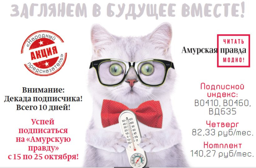 16 октября редакция приглашает любимых читателей на День подписчика, который пройдет на благовещенском почтамте по адресу ул. Пионерская, 27 с 12 до 14 часов. Всех подписавшихся в этот день ждут приятные сюрпризы от АП: кружки, подушки, футболки, и многое другое из серии сувениров, специально подготовленных к Году литературы. На следующей неделе наш коллектив планирует выезды на дни подписчика в Тамбовский, Константиновский, Ивановский районы. О графике выездов будет сообщено дополнительно.
