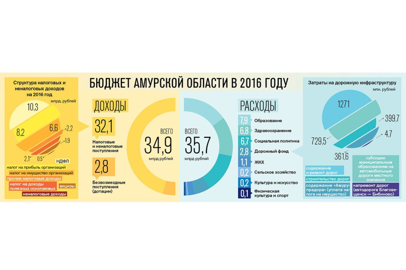 В 2016 году Приамурью придется сильно сократить свои расходы. По расчетам специалистов, доходы региона составят 34,9 миллиарда рублей (смотри инфографику). Это на 300 миллионов больше, чем в этом году, рассказала министр финансов Татьяна Половайкина. Расходы по сравнению с этим годом придется урезать на 1,6 миллиарда — до 35,7 миллиарда. Дефицит бюджета составит 800 миллионов — всего 2,6%.