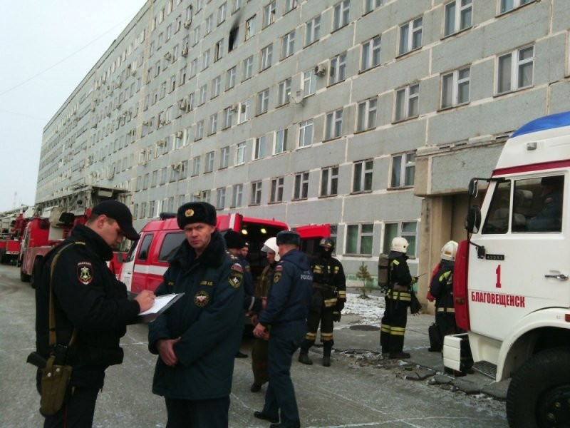 «При поступлении сообщения на место пожара по третьему номеру вызова оперативно выехали боевые расчеты пожарно-спасательных формирований города. Из помещений пятого, шестого, седьмого этажей больницы были эвакуированы 189 человек, тяжелобольных среди них нет. В результате пожара огнем повреждена кровать на площади около двух квадратных метров, закопчена палата по всей площади и частично коридор шестого этажа. Всего в тушении пожара были задействованы 54 человека и 18 единиц техники», — рассказал заместитель начальника главного управления МЧС России по Амурской области по государственной противопожарной службе Андрей Потахов.
