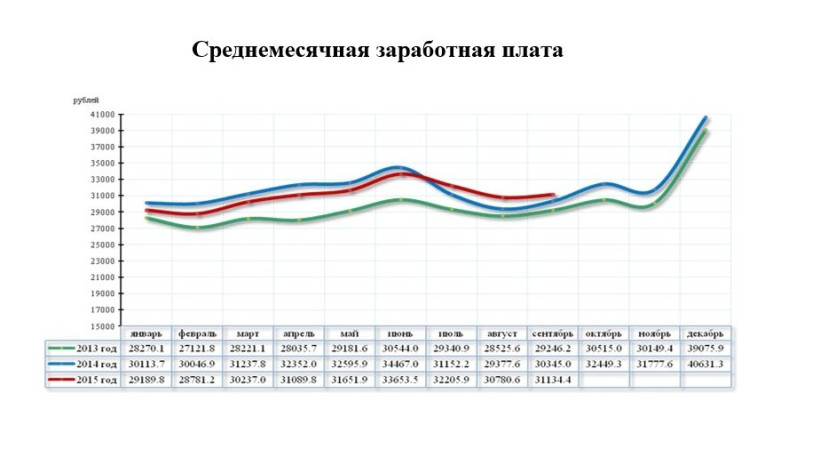 По сравнению с сентябрем 2014 года размер средней зарплаты увеличился на 2,6 %. Реальная заработная плата, рассчитанная с учетом индекса потребительских цен, составила 88,2 %. Больше всех в сентябре зарабатывали работники сферы транспорта и связи — 43,5 тысячи рублей. Работающие в сфере добычи полезных ископаемых получили в среднем 41,7 тысячи. Работники образования получали 23,5 тысячи в среднем, здравоохранения — 25,6 тысячи. В строительстве средняя зарплата составила 38 тысяч рублей. Работники торговли, а также ремонта по-прежнему зарабатывают меньше всего — около 16 тысяч рублей.