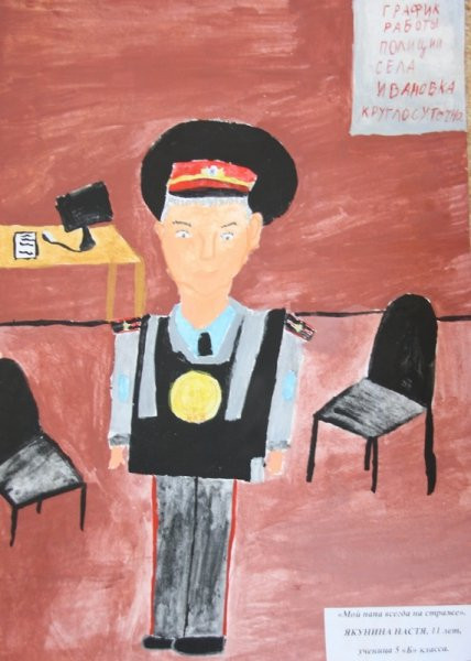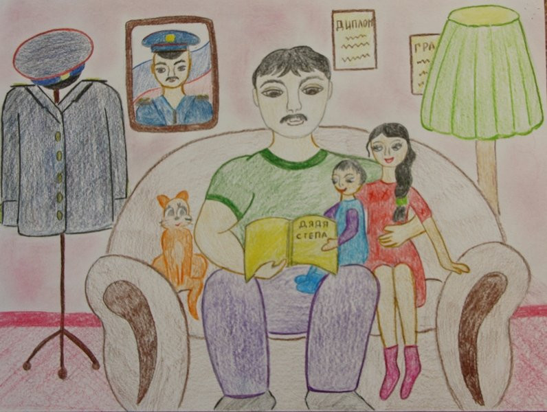 — На моем рисунке — папа, который читает нам книжку про дядю Степу: мне, коту Мурзику и брату Ярику, которому 1 год и 8 месяцев. Мой папа полицейский-водитель. Он возит сотрудников и преступников на уазике. На картинке также виден портрет папы на стене и грамоты. Ему давали диплом, за то, что он хороший работник. Все полицейские охраняют мир и порядок внутри страны. Я учусь в кадетском классе и мечтаю стать полицейским, как папа. Только я хочу воспитывать детей — заниматься несовершеннолетними.