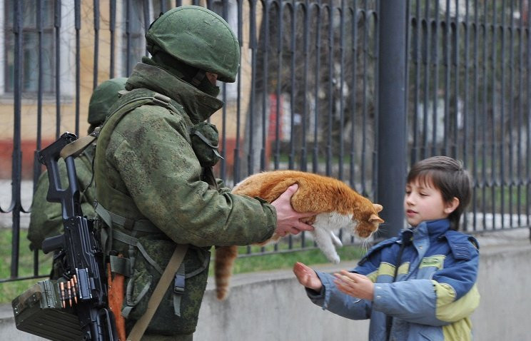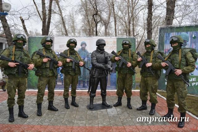 Первый в России памятник «вежливым людям» открылся 6 мая этого года в городе Белогорске Амурской области. В его основу легла фотография из серии «Вежливые люди» фотографа ТАСС Андрея Рюмина. На снимке запечатлен солдат спецподразделения, передающий ребенку котенка.