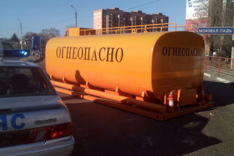 Сегодня, 26 ноября, в Благовещенске на кольцевой развязке на Театральной трал потерял цистерну с надписью «Огнеопасно». Емкость вместимостью 10 тонн не была закреплена и упала с перевозившего ее автомобиля, когда он начал двигаться по кольцу.