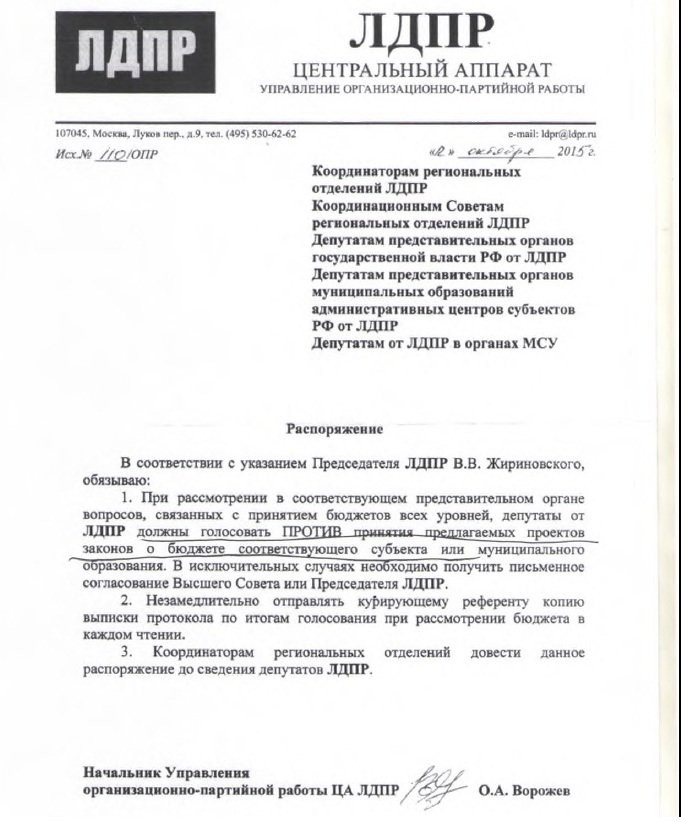 Кстати, он продемонстрировал любопытный документ, который напрямую касается действий, а точнее беспринципного бездействия другой политической силы — фракции ЛДПР. Спикер показал коллегам копию распоряжения Центрального аппарата Либерально-демократической партии России, в котором приказано: