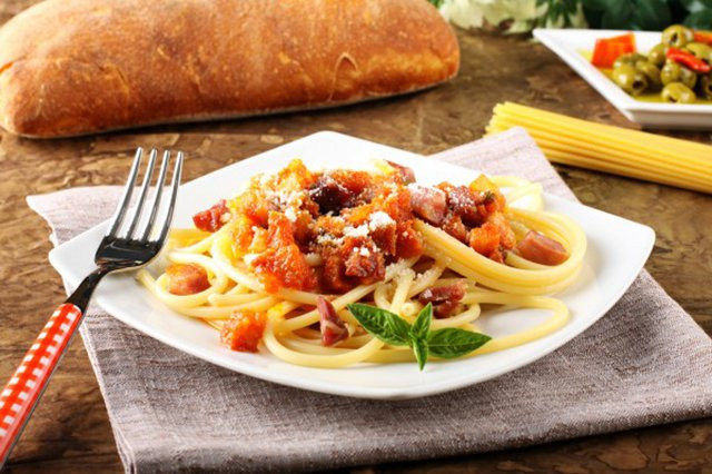 — Я безумно люблю пасту с соусом аматричана. Рецепт, который я предлагаю, родом из самого сердца Италии. Аматричана — это такой итальянский соус, основу которого составляет свиной бекон. Поверьте, это очень вкусно! Для приготовления нам понадобятся свежие помидоры, репчатый лук, свиной бекон, пармезан, специи и, конечно, паста из твердых сортов пшеницы. Для начала нужно разогреть сковороду и на небольшом количестве оливкового масла обжарить мелко нарезанный лук, после добавить бекон кубиками и обжаривать его таким образом, чтобы растопить жир. Далее необходимо положить порезанные помидоры без шкурки, специи. Мне очень нравится базилик, перец, прованские травы, можно добавить лавровый лист. Содержимое сковороды необходимо потушить. Чем дольше, тем лучше, у меня это занимает примерно час. В соус можно влить немного белого сухого вина. После добавить пасту, я рекомендую использовать спагетти, феттучче или тальятелле — тщательно перемешать и посыпать свежим пармезаном. Это мое любимое блюдо! Приятного аппетита и привет из Италии!