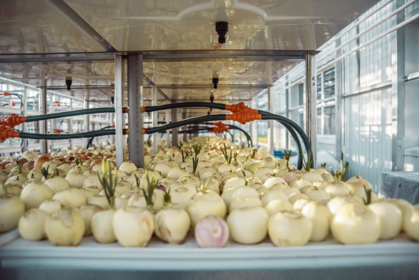 В одной из теплиц здесь разместилась луковая линия, которая даст первый урожай уже к 15 января. На специальных секциях здесь лежат луковки, большая часть которых только готовится выпустить зеленое перо. На комбинате уже подсчитали примерную отпускную стоимость продукции — около 200 рублей за килограмм.