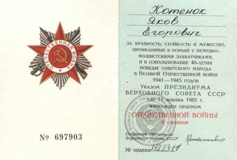Мой прадедушка Яков Егорович Котенок родился в многодетной семье. После совершеннолетия он поехал на Дальний Восток и устроился работать шахтером на рудник в Якутии. В 1941 году по всеобщей мобилизации его призвали на фронт. Он попал в 116‑й Новороссийский краснознаменный стрелковый полк 21‑й стрелковой дивизии, дислоцировавшийся на Дальнем Востоке в Спасске-Дальнем. До начала переброски дивизии на фронт он усиленно проходил военную подготовку в качестве стрелка. В сентябре его полк перебросили на фронт в район Ленинграда. Прадед рассказывал, что в то время они построили много блиндажей, ходов и сообщений. Говорил, что их сильно досаждали «кукушки» — финские снайперы.