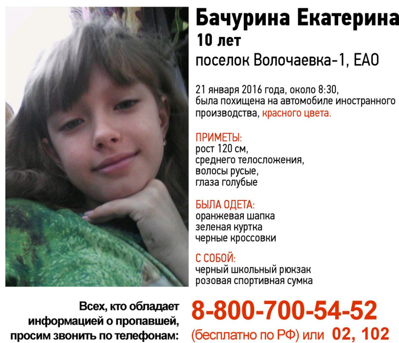 В Еврейской автономной области возбуждено уголовное дело по факту исчезновения 10-летней девочки. Катя Бачурина пропала вчера, 21 января, в поселке Волочаевка-1 Смидовичского района. Утром ребенок ушел в школу и не вернулся.