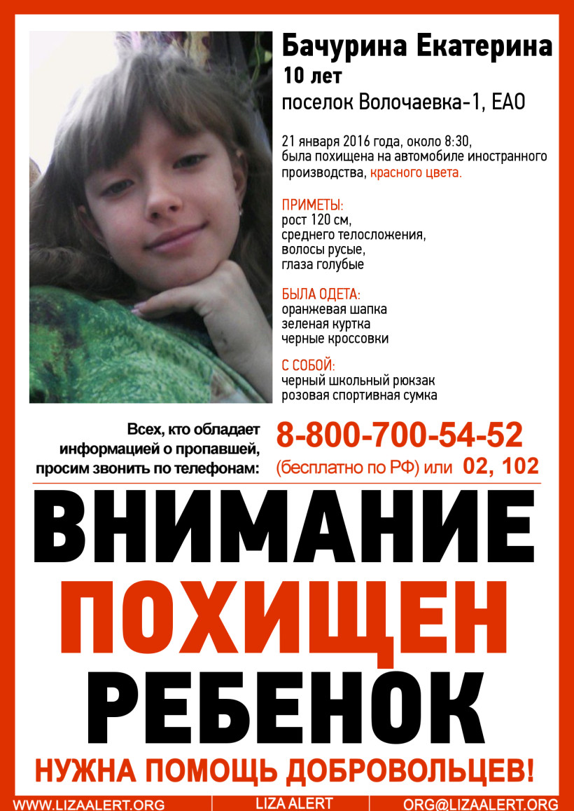 Похищенную 10-летнюю Катю Бачурину из Еврейской автономии нашли в Амурской области. Подробности задержания предполагаемого похитителя читайте ЗДЕСЬ.