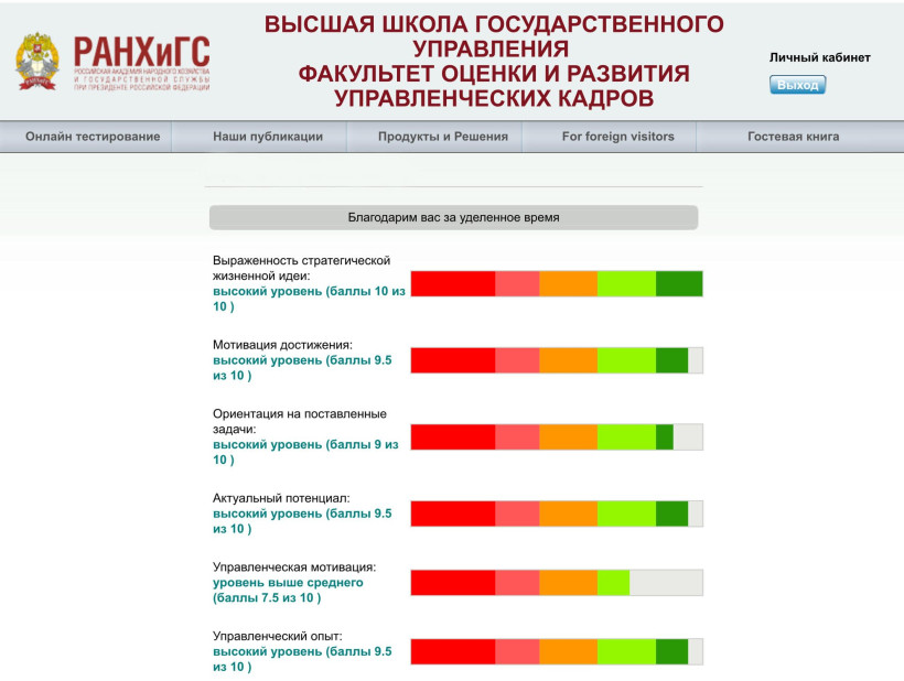 Второй тест определял управленческий уровень глав. Результат представлен в виде итоговых значений, характеризующих несколько качеств, необходимых любому руководителю (смотри фото).