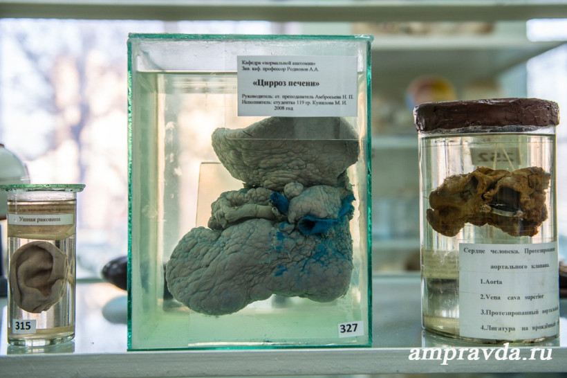 Анатомический музей Амурской медицинской академии считается одним из лучших на Дальнем Востоке. Здесь собраны сотни уникальных экспонатов — от почечных камней, извлеченных благовещенскими хирургами во время операций, до младенцев с различными уродствами, появившихся на свет в роддомах Амурской области. Сотрудники кафедры анатомии и оперативной хирургии провели для журналистов АП экскурсию, показали легкие курильщика и сделанную своими руками злокачественную опухоль, рассказали, к чему может привести прием снотворных во время беременности и кто придумал выкапывать трупы, чтобы изучать человеческий организм.