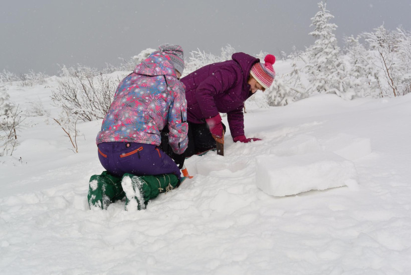— Высота была 1 250 метров. Искали плотный снег, подходящий для кирпичей, и площадку для строительства. Нужную не нашли, поэтому строить пришлось прямо на замерзшей земле, а не на толстом снежном насте. Снежные кирпичи резали обычной ножовкой. Пытались делать размером 20 на 40 на 60 сантиметров. Этим занимались девушки и носили мне их, а я строил, — рассказал о необычном опыте возведения эскимоского дома руководитель тургруппы Владимир Гуторов. —Правда, снег был не очень хорошим, попадались и хорошие куски, но многие были неоднородными и разваливались. Поэтому кирпичи в нижнем слое начали разрушаться. Иглу немного недостроили из-за плохой погоды. Нам еще полтора часа нужно было, чтобы закончить, но начался снегопад, быстро потемнело, задул ветер. мы быстро внутри хижины сфотографировались и побежали назад.