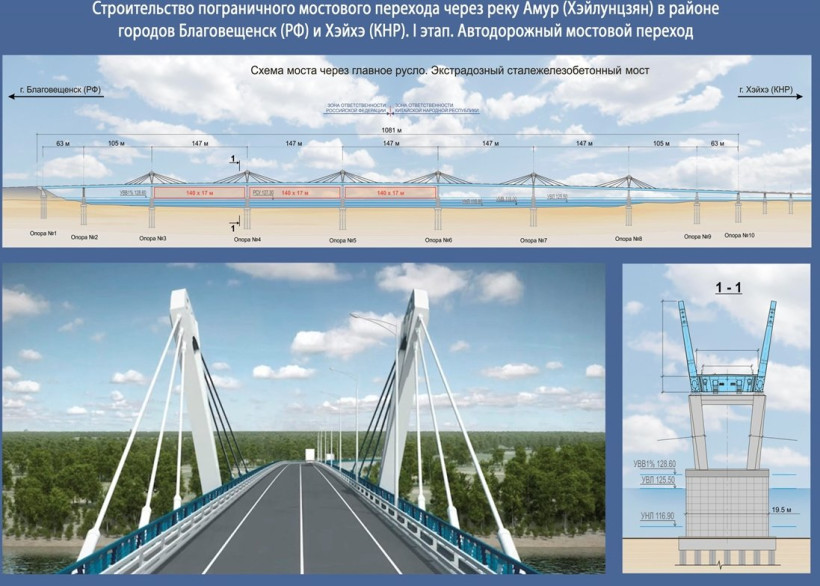 На первом этапе предполагается построить автомобильный мост через Амур, на втором —железнодорожный. До 1 апреля проект мостового перехода должен поступить на госэкспертизу. Проектными работами занимается «Институт Гипростроймост», который проектировал переход через Зею.