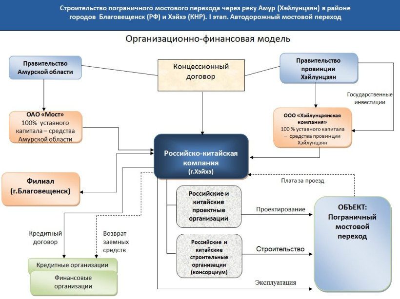 Проект строительства мостового перехода в Поднебесную, который обсуждается с прошлого века, перешел к практической реализации. В минувшие выходные завершились переговоры рабочих групп двух стран. В комиссии помимо чиновников входили экономисты, банковские работники, юристы. Созданное совместное предприятие с ограниченной ответственностью возьмет на себя функцию концессионера (частного партнера), который будет строить и эксплуатировать международный мостовой переход. Активы предприятия распределены в равных долях между россиянами и китайцами — по 50 процентов.