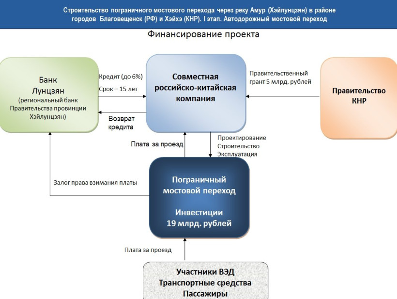 В ходе нынешних переговоров были одобрены долгосрочные концессионный и кредитный договоры, по которому привлекут средства на реализацию проекта. Как отметила первый зампред правительства области Марина Дедюшко, по всем основным моментам достигнуты соглашения. На четвертый квартал 2015 года предварительная стоимость строительства оценивается в 18,8 миллиарда рублей. Из них 13,6 миллиарда — на российскую часть и 5,2 миллиарда — на китайскую. Такое соотношение объясняется тем, что две трети сооружения расположится на амурской территории — протяженность перехода 70 на 30 в нашу пользу. При этом средства бюджета РФ привлекать не будут.