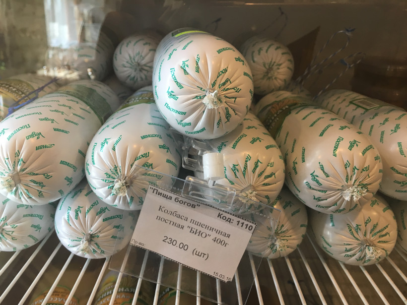 На прилавке необычной торговой точки с божественным названием несколько видов пшеничной колбасы: постная, с сыром, с грибами, с оливками, с пикантными травами. Рядом нежные сосиски и сардельки «Шпикачки»— также из пшеницы. Постную растительную ветчину с началом Великого поста разобрали первой. Цена продукции в пределах 210—240 рублей, в зависимости от массы продукта.