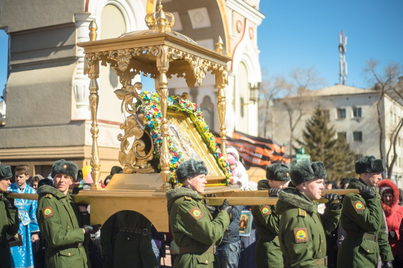Сегодня, 22 марта, в Благовещенске состоялся крестный ход в честь большого юбилея —350 лет назад главная чудотворная святыня Дальнего Востока, Албазинская икона, прибыла в Приамурье. Утром в кафедральном соборе Благовещения Пресвятой Богородицы началась праздничная литургия. Ее совершили четыре дальневосточных архиерея — митрополит Хабаровский и Приамурский Игнатий, епископ Благовещенский и Тындинский Лукиан, епископ Биробиджанский и Кульдурский Ефрем и епископ Амурский и Чегдомынский Николай. После службы от собора под пение церковных хоров и колокольный звон крестный ход отправился по городу. Священнослужители, первые лица города и области перенесли Албазинскую икону на площадь Победы, где около Триумфальной арки состоялся благодарственный молебен. Завершились праздничные мероприятия в АОДНТ показом народного фильма «Албазинская икона Божией Матери».