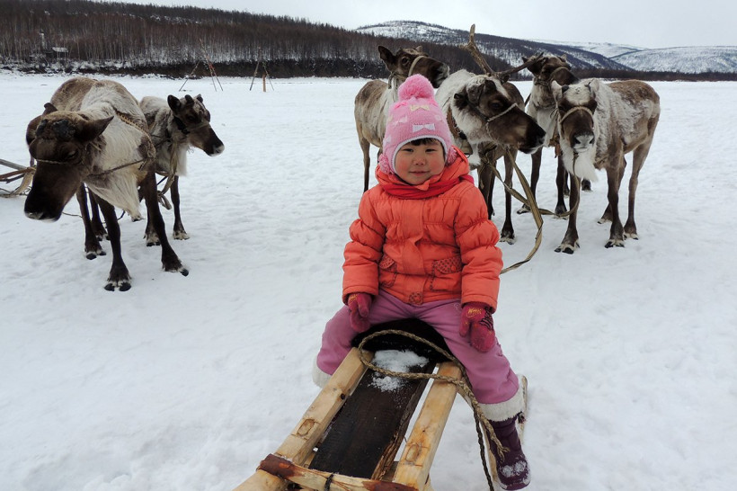 Елена — оленевод, ее семья держит 20 голов. Вместе с мужем и четырехлетней дочерью Лейлой живут на стойбище. Сразу после родов она отправилась в тайгу помогать супругу. «Да разве там тяжело? — улыбается женщина. — Наоборот: свежий воздух, детки не болеют, хотя бегают по палатке босиком. Их из тайги не вытащишь. С такими большими щеками в село приезжают».
