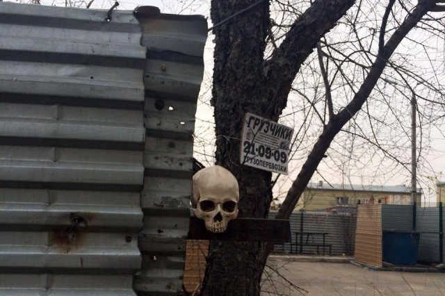 Читатель « Амурской правды» сфотографировал висящий на дереве череп и прислал снимок в редакцию. Фотография сделана практически в центре Благовещенска, около пункта пропуска через границу, по улице Краснофлотской – между Политехнической и Чайковского.