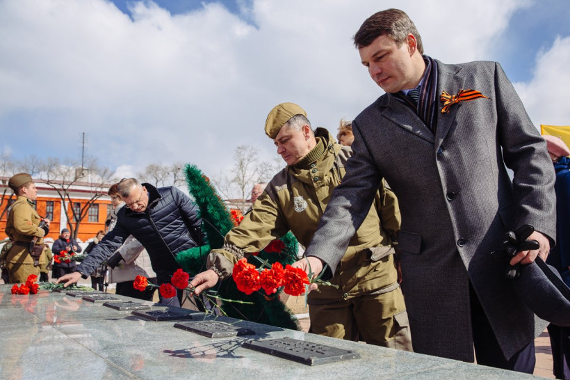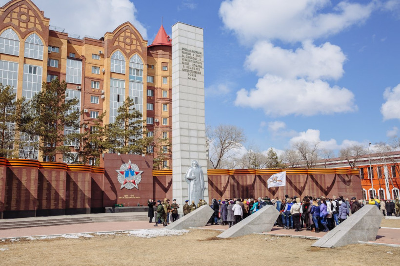 Город стал участником Всероссийской акцииСегодня, 9 апреля, ровно за месяц до Дня Победы, амурчане стали свидетелями исторического момента – на площади Победы Благовещенска участники Международного общественно-патриотического проекта «Звезда нашей Великой Победы» передали молодому поколению амурчан масштабную, в 200 квадратных метров, копию Знамени Победы. Такое же полотнище вручается жителям всех 150 населенных пунктов, через которые проходит маршрут автопробега памяти. В числе встречающих знамя был председатель регионального Законодательного собрания, лидер амурского отделения партии «Единая Россия» Константин Дьяконов.