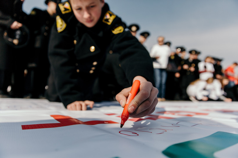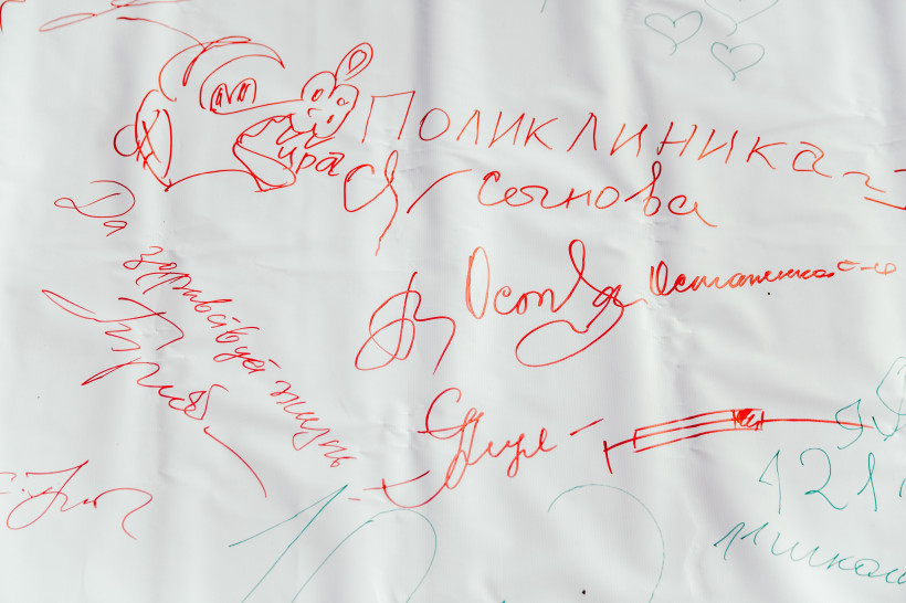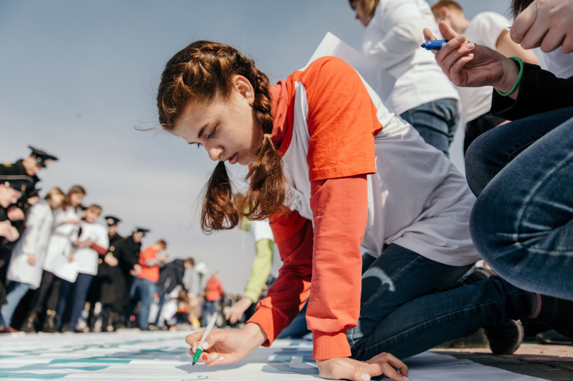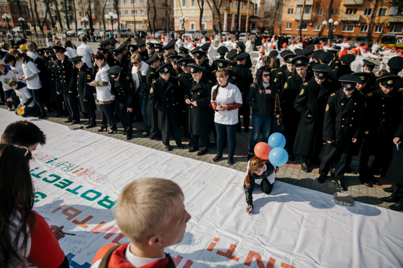 Прямо на набережной активисты расстелили огромный плакат длиной в несколько метров с лозунгом акции «Предупредить — защитить — привить». Многочисленные участники флешмоба написали на нем свои призывы вакцинироваться, оставили автографы и пожелания вроде «Да здравствует жизнь!».