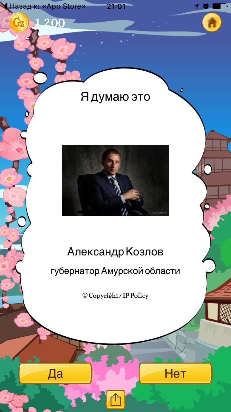 Еще одна популярная игра среди пользователей смартфонов — «Акинатор» — тоже не оставила без внимания наш регион. Среди персонажей, который угадывает этот ресурс, есть и губернатор Амурской области Александр Козлов. Чтобы угадать его, «Акинатору» потребовалось задать 22 вопроса. Помогают вопросы о том, политик ли этот человек, моложе ли он 40 лет, имеет ли отношение к конькам. К слову, это персонаж загадывали в игре более двухсот раз.
