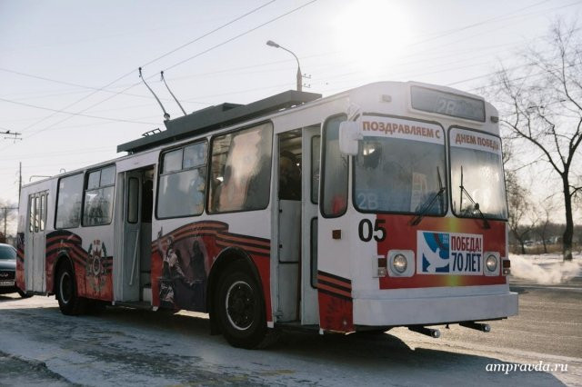 В День Победы, 9 мая, жители и гости Благовещенска смогут стать зрителями выступлений творческих коллективов Благовещенска в городском необычном транспортном средстве – «Победном троллейбусе».