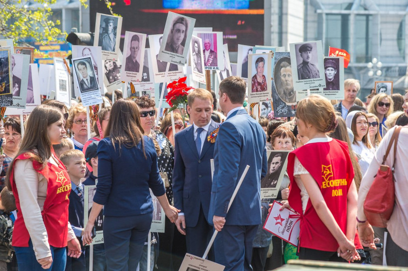 Большой фоторепортаж «Амурской правды»Около 10 тысяч человек встали сегодня, 9 Мая, в «Бессмертный полк» в Благовещенске. За полтора часа до начала шествия к ОКЦ начали стекаться люди — молодые и пожилые, с фотографиями своих родных, воевавших за мирное небо. Благовещенцы шли на большой праздник — с воздушными шарами, георгиевскими лентами. Украшением полка стали дети, одетые в гимнастерки и пилотки, с портретами своих дедов и прадедов в руках. Вместе со своими близкими в строй встали и известные люди нашей области. Прошел в полку с супругой и губернатор области Александр Козлов.