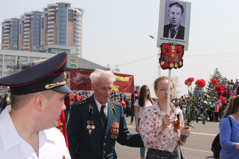 Таких, как Андрей, здесь собрались не сотни — тысячи. Колонны «Бессмертного полка» растянулись на несколько кварталов. Тут и там мелькают с пожелтевших фотографий молодые и открытые лица. Когда была дана команда, колонны двинулись к центру города. То и дело по рядам проносились троекратное «Ура!». С радостными лицами несли благовещенцы портреты тех, кто отдал жизнь за детей, внуков, правнуков. Впервые и мой дед встал рядом. Многотысячная толпа дошла до площади Победы, и все никак не расходилась. «Бессмертный полк» выстроился, чтобы принять поздравления от первых лиц области и города. Здесь сегодня весь день будут звучать любимые военные песни, звучать стихи о войне — для горожан и гостей Благовещенска и для тех, которых нельзя забыть.