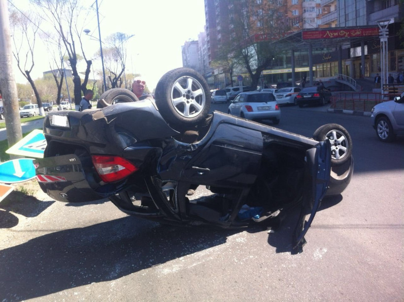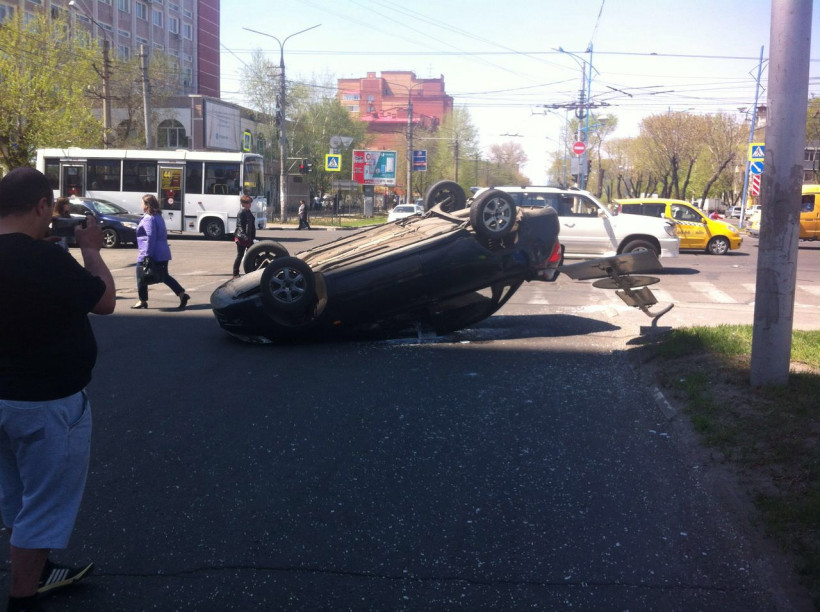 Сегодня, 10 мая, в центре Благовещенска перевернулся автомобиль. По словам очевидцев, от удара «Мерседеса» машина взелетела в воздух и приземлилась на крышу.