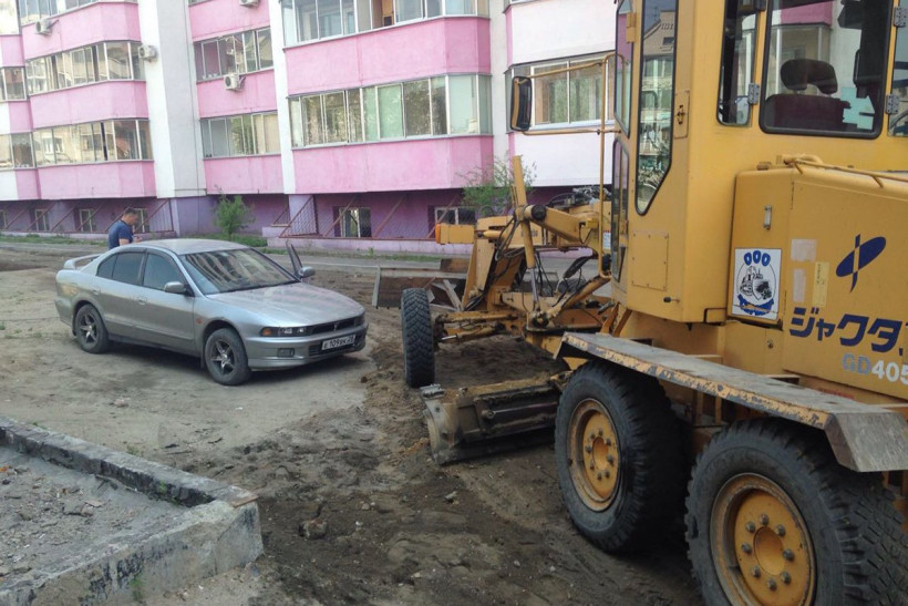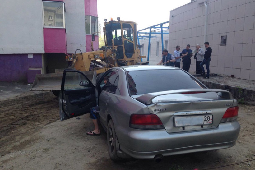 В Благовещенске сегодня, 23 мая, грейдер наехал на иномарку. ДТП произошло во дворе дома по улице Зейской, 232. Ехавший по двору KOMATSU сдавал назад, не заметил Mitsubishi Galant и наехал на автомобиль.