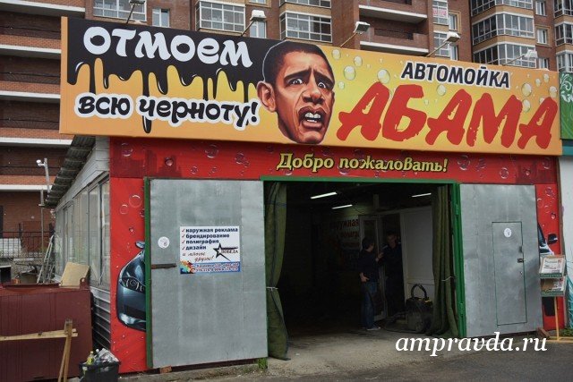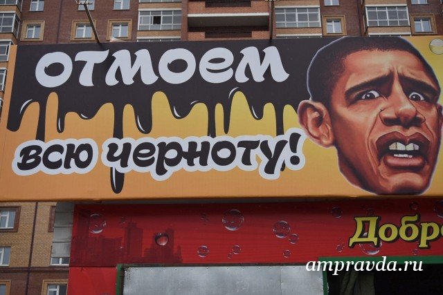 Небольшая автомойка на несколько машин находится в микрорайоне, в нескольких метрах от редакции «Амурской правды». Наверху смешной, но вполне узнаваемый портрет американского лидера Барака Обамы и многообещающая надпись: «Отмоем всю черноту!» Из-за дождя вчера в момент нашего приезда клиентов на обновленной мойке не было, лишь одиноко скучал сотрудник Виктор.