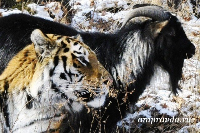Тигр Амур в Приморском сафари-парке неожиданно для всех подружился со своей потенциальной добычей — козлом. Несколько месяцев они жили в одном вольере, но в итоге Амур все-таки напал и ранил Тимура. В рану попали бактерии, козла прооперировали в одной из ветеринарных клиник Владивостока — удалили небольшой осколок кости. Состояние животного немного улучшилось. Однако Тимуру пришлось продолжить свое лечение в ветеринарной Академии имени Скрябина в Москве.
