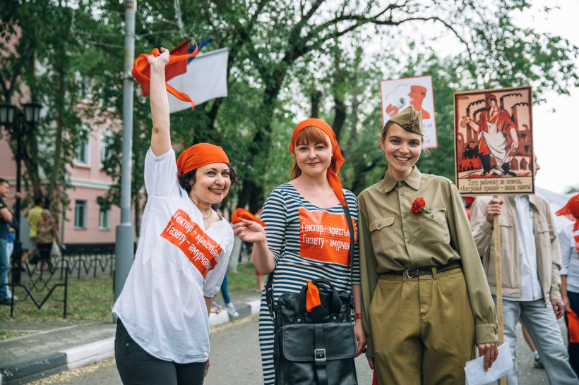 Колонна газеты «Амурская правда» стала одной из лучших в шествии, приуроченном к юбилею Благовещенска. Коллектив АП победил в номинации «Верность своему бренду». Коллектив вспомнил далекий и революционный 1918 год, в котором была создана наша газета — колонна была оформлена в соответствующем стиле.