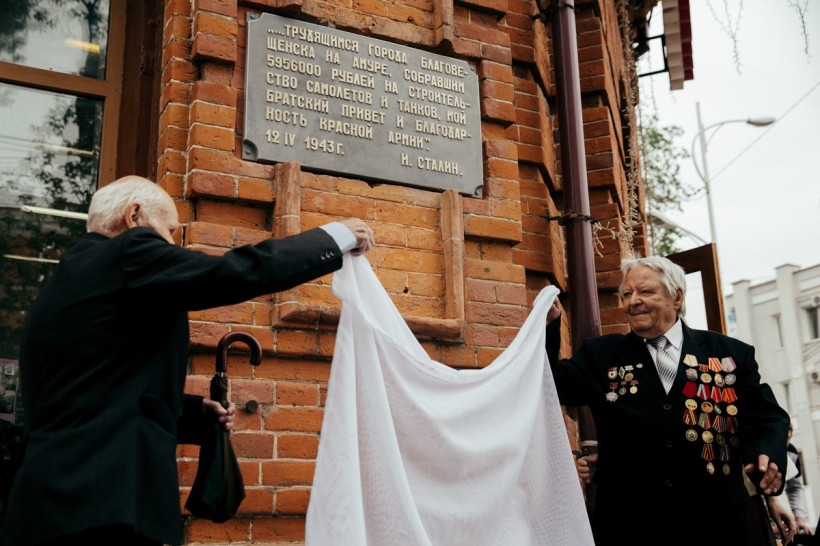 Сегодня, 22 июня, в день начала Великой Отечественной войны на здании бывшего гастронома торжественно открыли мемориальную доску с текстом телеграммы, которую прислал благовещенцам генералиссимус Иосиф Сталин в 1943 году. Металлическую копию отлили на ремонтно-механическом заводе, для ее изготовления привлекли 120 тысяч внебюджетных средств. «Благодарность от Сталина — это оценка труда жителей Благовещенска во время войны, это кровь, слезы и пот трудового народа. Для меня место, где установлена табличка — святое. И я благодарен губернатору Александру Козлову, что он исполнил мою просьбу вернуть табличку на место», — со слезами на глазах говорит инициатор восстановления точной копии благодарственной телеграммы 80-летний горожанин Владимир Федченко.