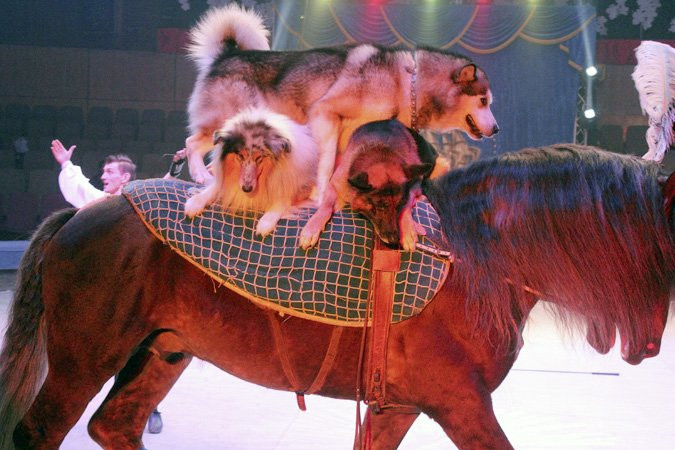Однако самые главные звезды представления, конечно, артисты. В первой части шоу — это орангутанг Соня, которая играет на гармошке, и медведи, исполняющие цыганский номер. Во второй — собаки, катающиеся на лошадях, и силач, жонглирующий работающими бензопилами.