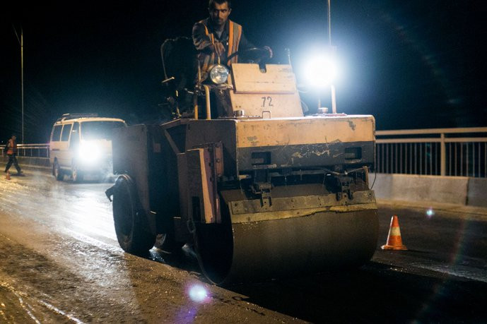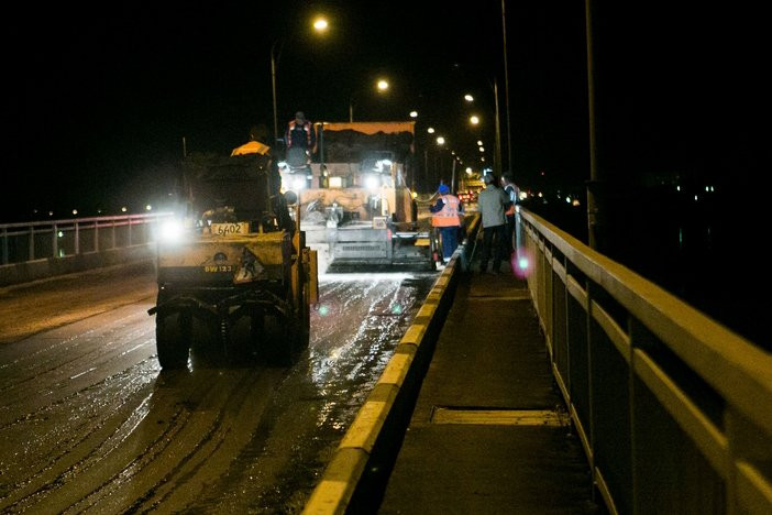 Полный ремонт покрытия моста не проводился более 30 лет. Работы начались три дня назад, и ведутся по ночам — с 22:00 до 06:00. Для этого на мосту перекрывают одну полосу движения. Уже отремонтировано более 700 метров дорожного покрытия.